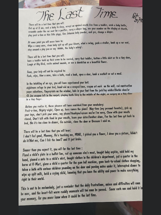 Having grandchildren, being able to be a part of their lives, watching them grow up and being able to pour into their lives ensures that perhaps that wasn’t the ‘Last Time’. Even better? The second time around we have a bit more wisdom, more patience and a whole lot more time. Perhaps I will still be around to have those moments with my great-grandchildren.
